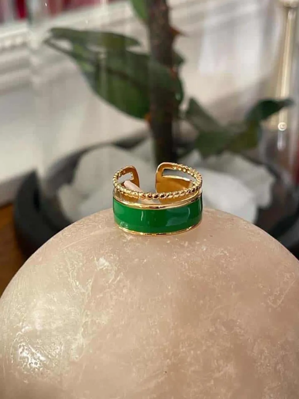 La Bague Ajustable Tess Est En Acier Inoxydable Doré. Elle Est Joliment Surmontée D’Une Pierre Ovale De Couleur Verte . On Aime Le Feuilleté De Son Anneau Juste Magnifique. C’Est Un Modèle Ajustable Que Vous Pouvez Porter Au Doigt De Votre Choix, Et Ainsi Vous Pouvez Vous L’Offrir, Ou Offrir, Sans Le Souci De La Taille.