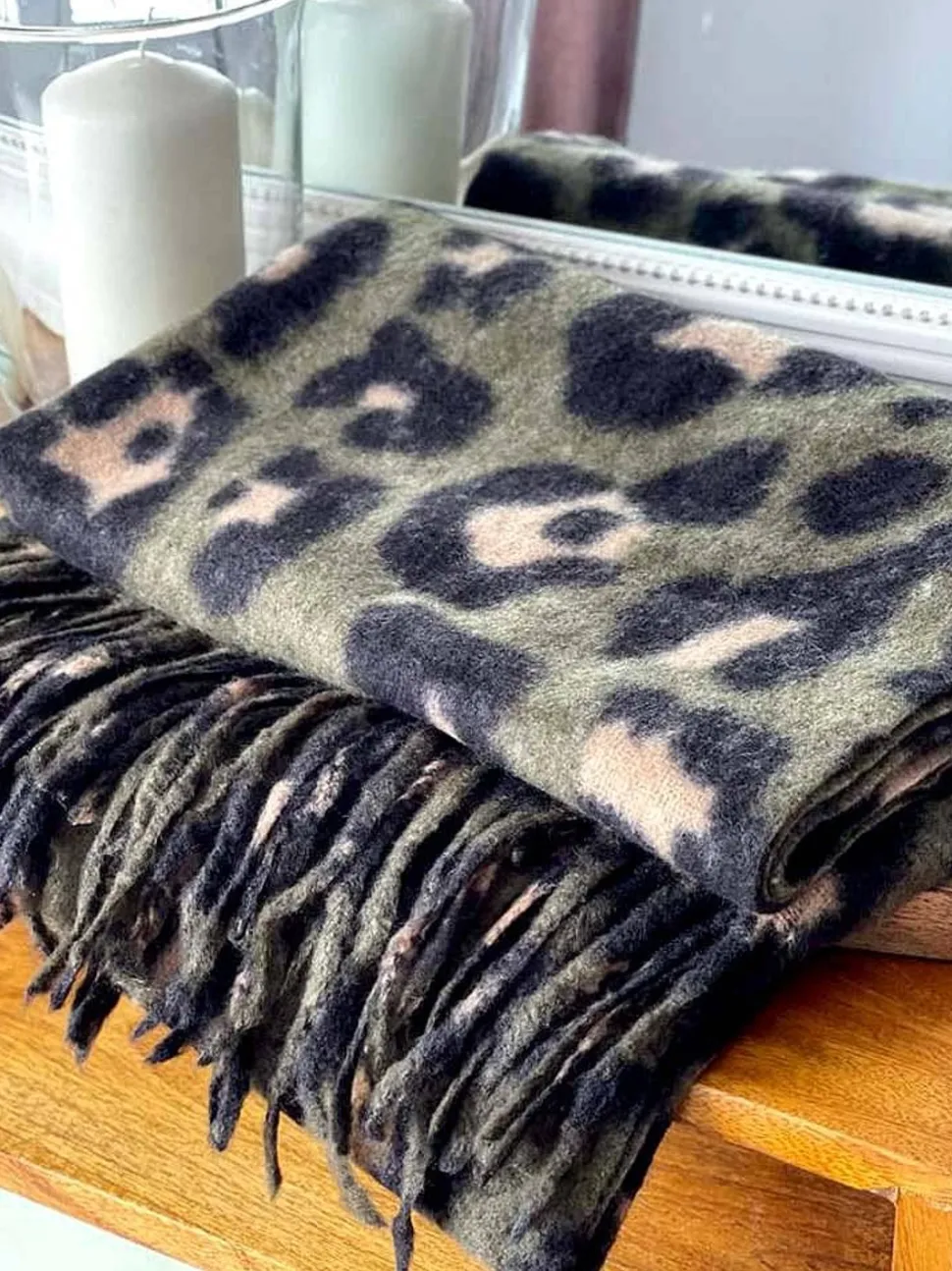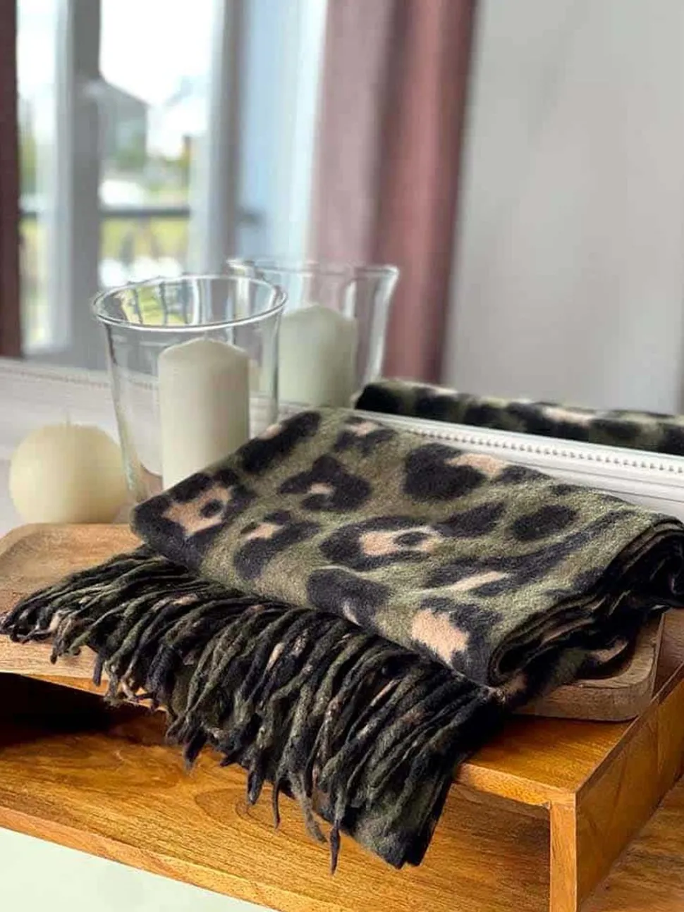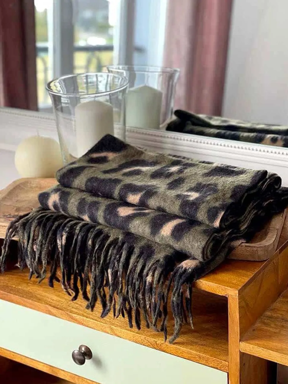 Enveloppez-Vous Dans L’Élégance Avec L’Écharpe En Laine Vert Kaki Catalina, Un Accessoire Qui Promet Non Seulement De Vous Garder Au Chaud, Mais Aussi De Rehausser Votre Style Avec Son Imprimé Animal Distinctif. Catalina Est Plus Qu’Une Simple Écharpe, C’Est Un Investissement Dans Votre Confort Et Votre Élégance.