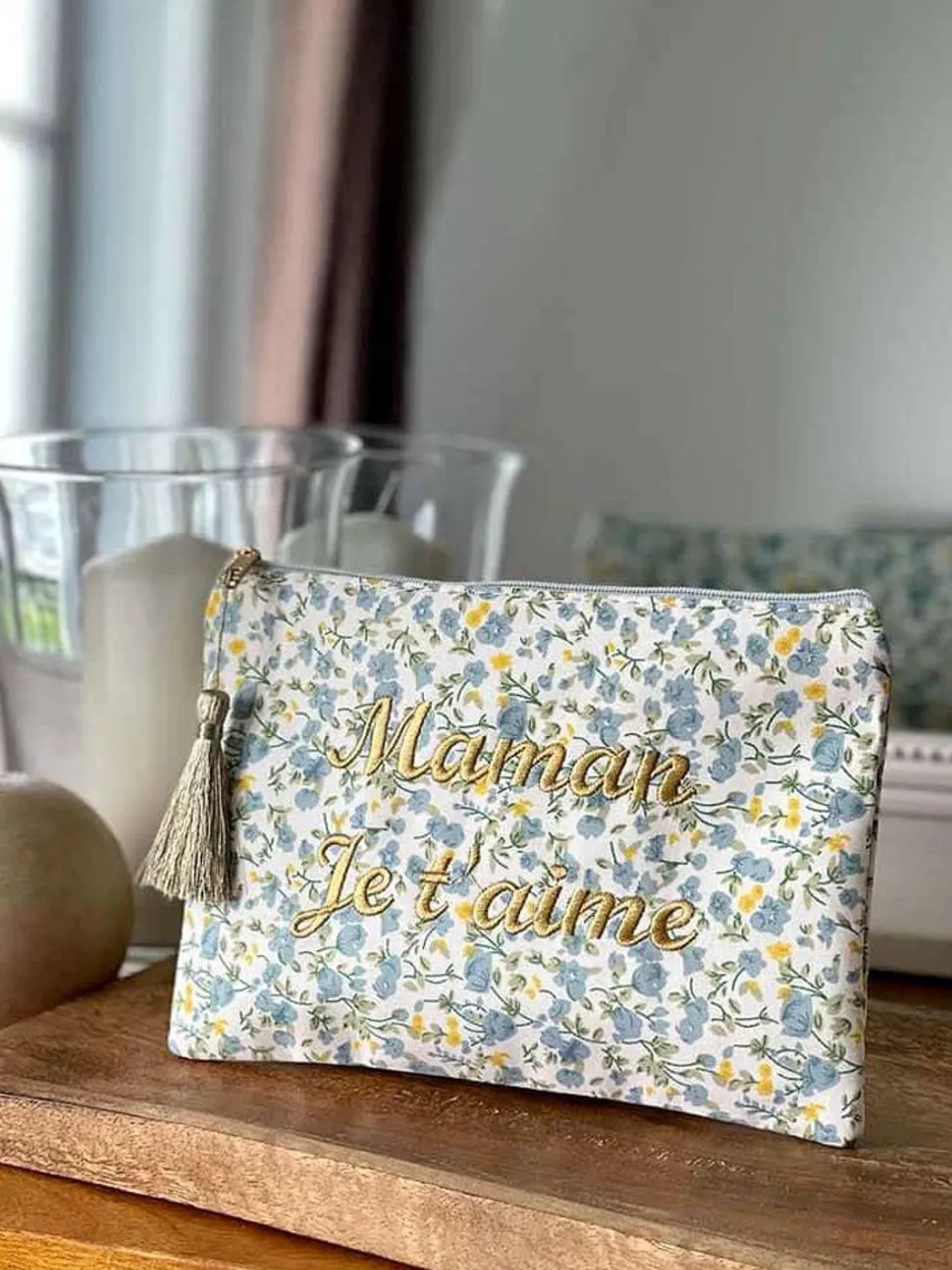Pratique, Vous Apprécierez Cette Jolie Petite Pochette Bleue À Message Taje. Elle Est Idéale Pour Y Ranger Son Essentiel, Son Petit Bazar, Son Maquillage… On Craque Pour Le Petit Message “Maman Je T’Aime” Joliment Brodé En Fils Dorés Sur La Pochette.