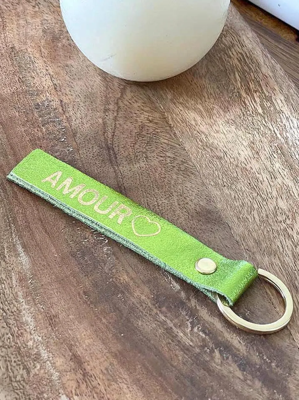 Le Porte-Clés En Cuir Vert Anis Daisy A Une Taille Idéale Et Un Anneau Robuste En Métal Doré. Il A Été Conçu Pour Garder Toutes Vos Clés En Sécurité Avec Style. La Typographie Dorée Du Mot “Amour” Ajoute Une Touche D’Éclat Et D’Élégance À Ce Joli Porte-Clés.