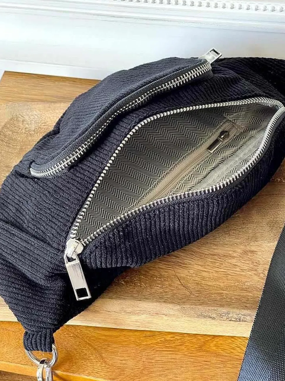 Avec Sa Bandoulière Amovible Et Ajustable, Le Sac Banane En Velours Côtelé Noir Estela Peut Se Porter En Croisé, À L’Épaule Ou À La Taille, Vous Offrant Une Allure À La Fois Tendance Et Décontractée. Il Est D’Une Taille Parfaite, Et Sa Petite Poche Sur L’Avant Le Rend Irrésistible Et Pratique Pour Un Usage Quotidien, En Toute Occasion Et À Chaque Moment De La Journée.