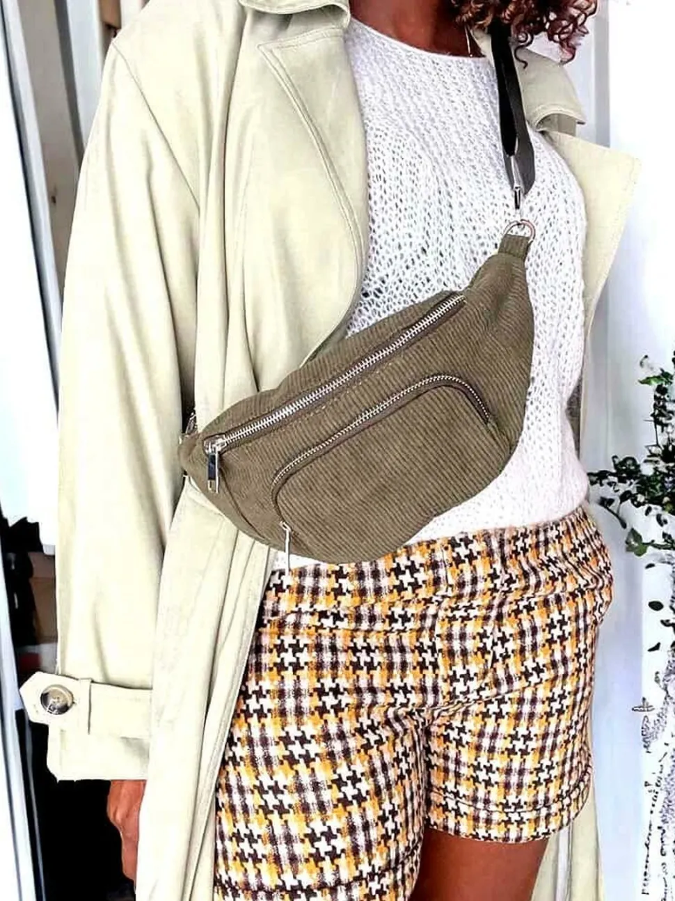 Avec Sa Bandoulière Amovible Et Ajustable, Le Sac Banane En Velours Côtelé Vert Kaki Estela Peut Se Porter En Croisé, À L’Épaule Ou À La Taille, Vous Offrant Une Allure À La Fois Tendance Et Décontractée. Il Est D’Une Taille Parfaite, Et Sa Petite Poche Sur L’Avant Le Rend Irrésistible Et Pratique Pour Un Usage Quotidien, En Toute Occasion Et À Chaque Moment De La Journée.