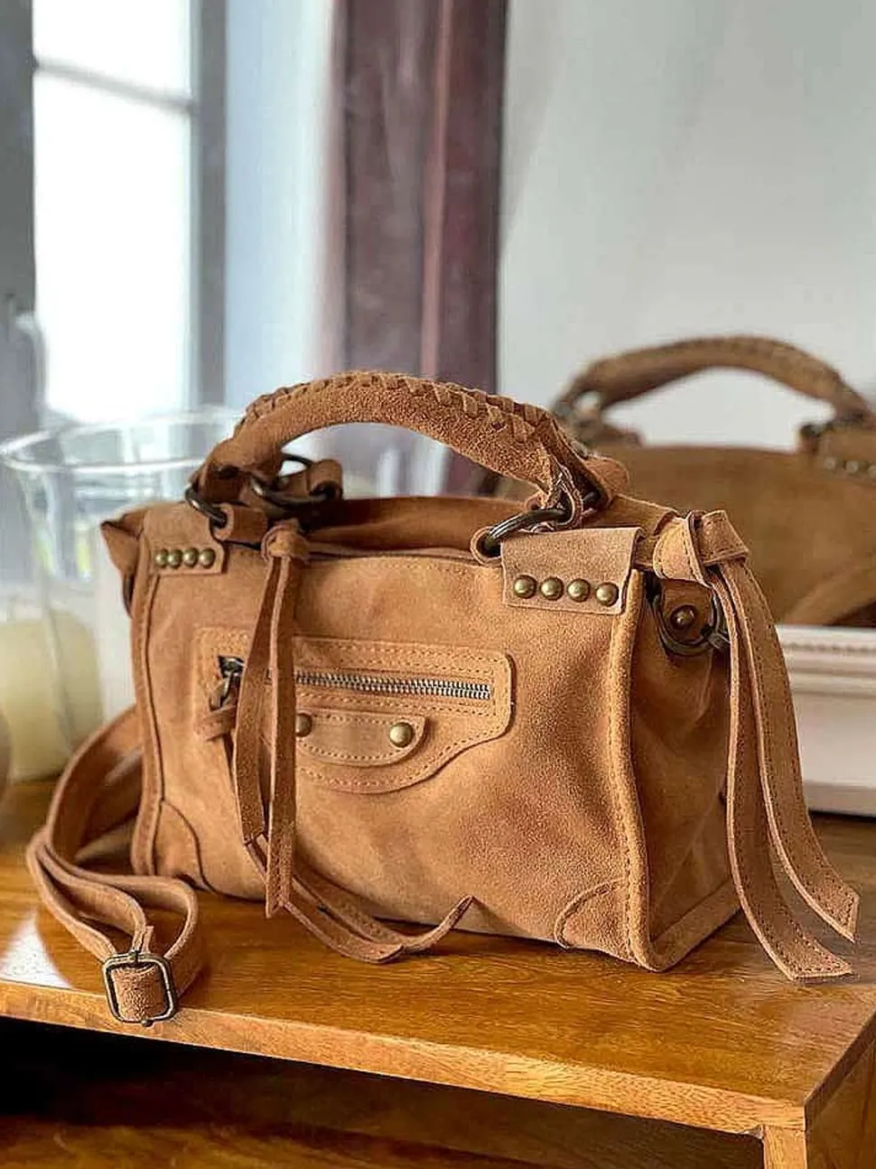 Le Sac À Main En Cuir Nubuck Marron Camel Bradie Est L’Accessoire Ultime Pour Les Amateurs De Style Chic Et Rock. Fabriqué En Italie Avec Du Cuir Italien De Qualité, Ce Sac Est Un Symbole D’Artisanat Raffiné Et De Design Élégant.